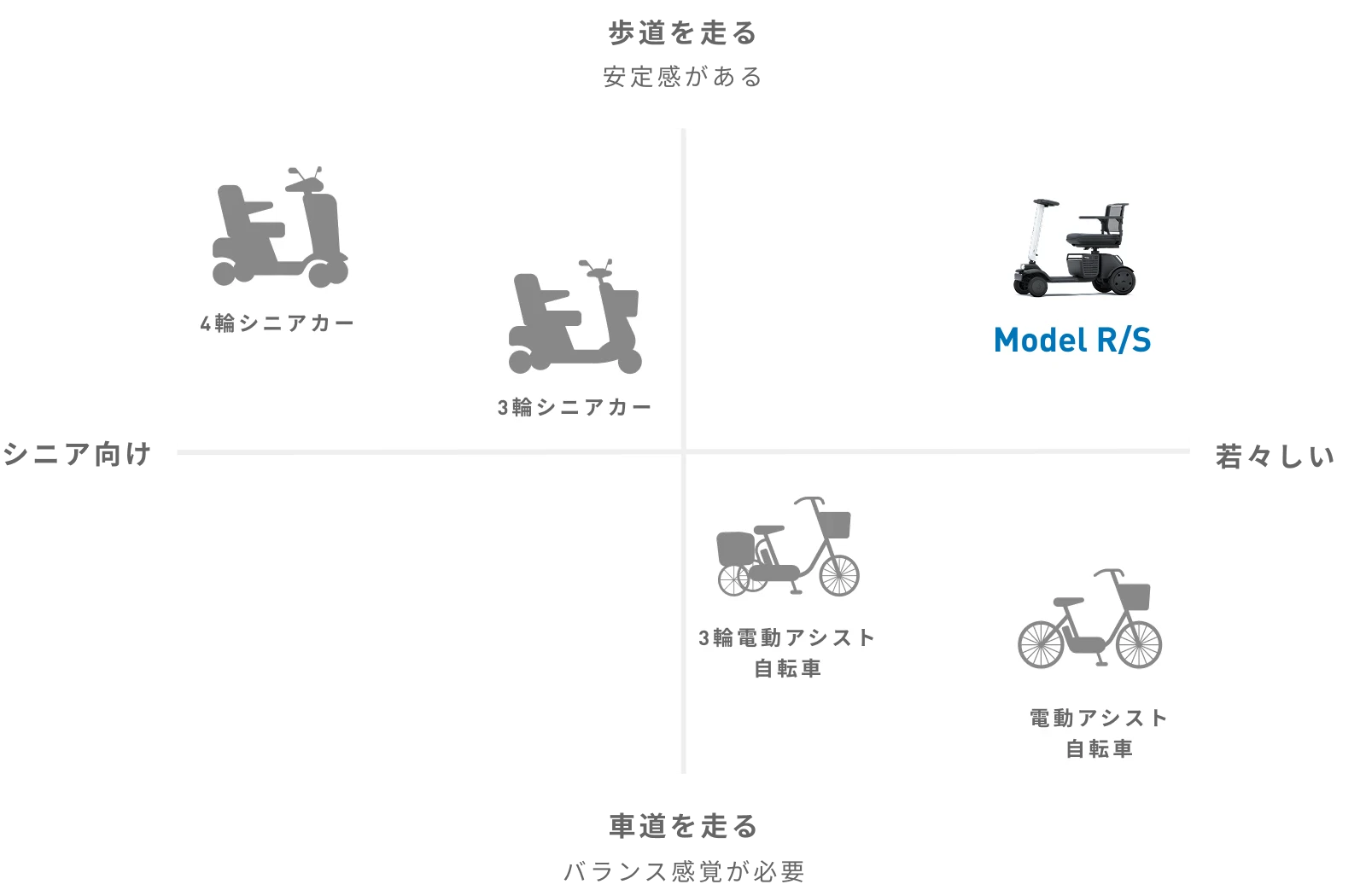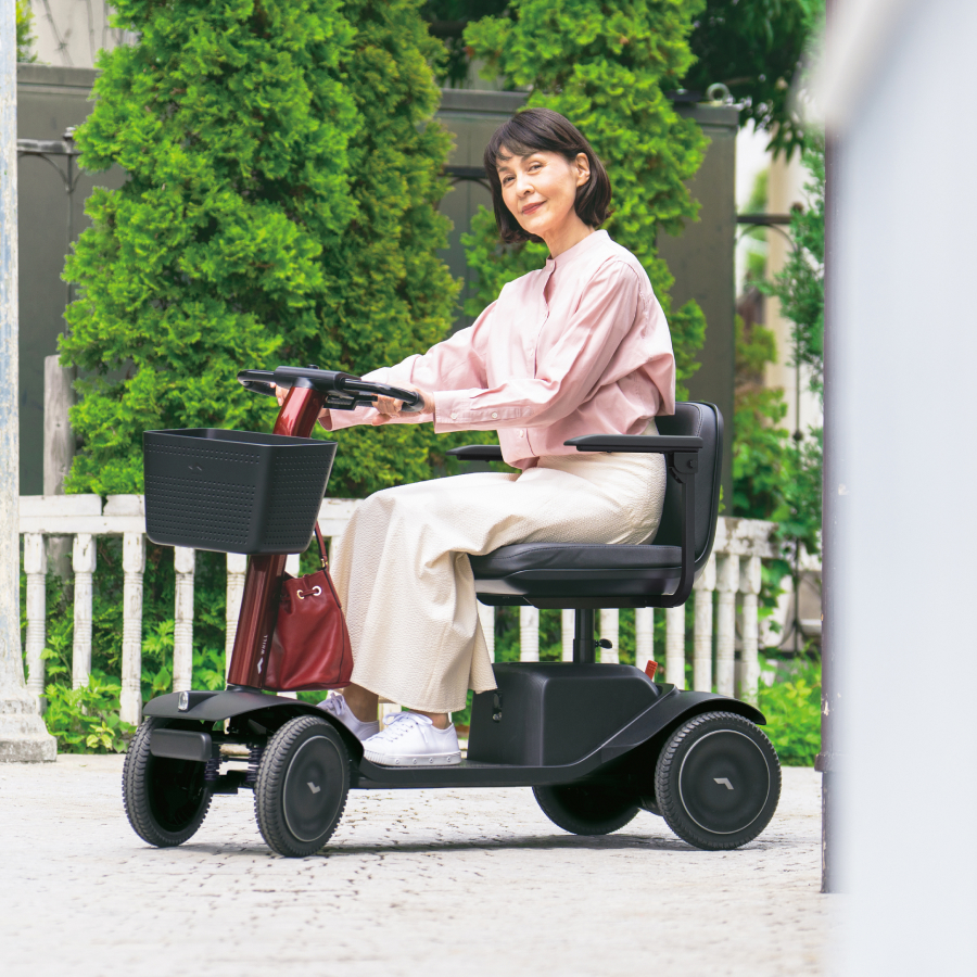 以下のように、4輪であるため、電動アシスト自転車よりも安定していて、シニアカーよりもスタイリッシュなデザイン。また価格帯も一般的なシニアカーよりもお買い求めやすい価格帯になっています。